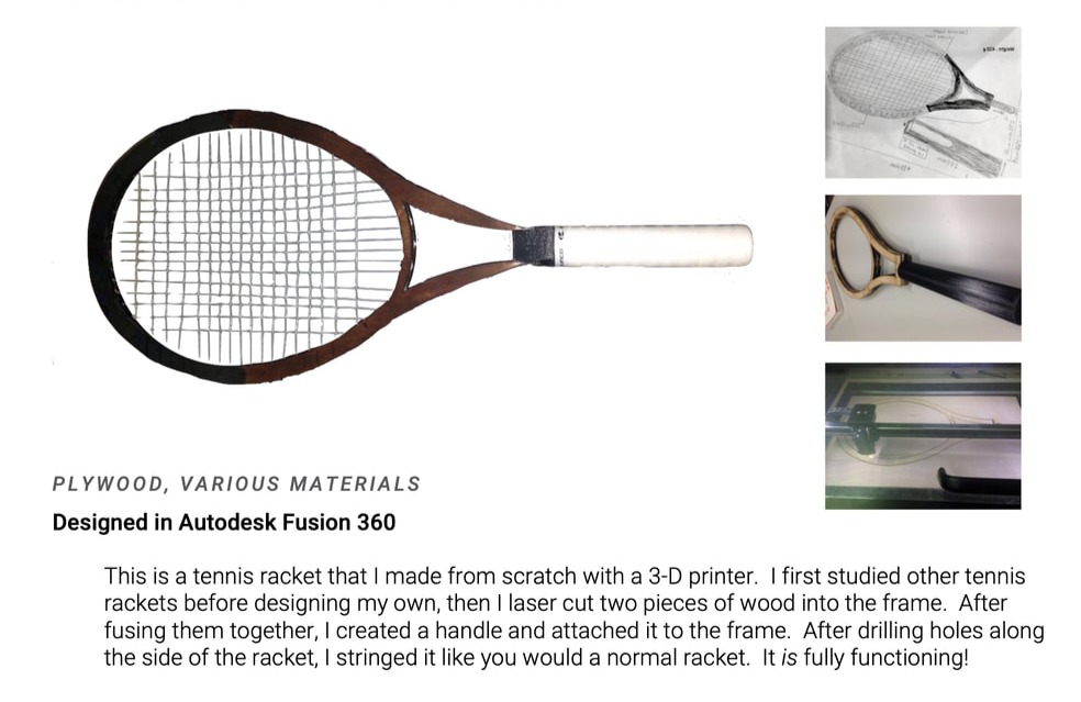This is a fully functioning tennis racket that I made and designed myself. I first made the 3D file on Fusion 360 and laser cut the racket head shape on two pieces of plywood. Also using Fusion 360, I 3D printed the tennis racket handle which I then attached to the racket head.